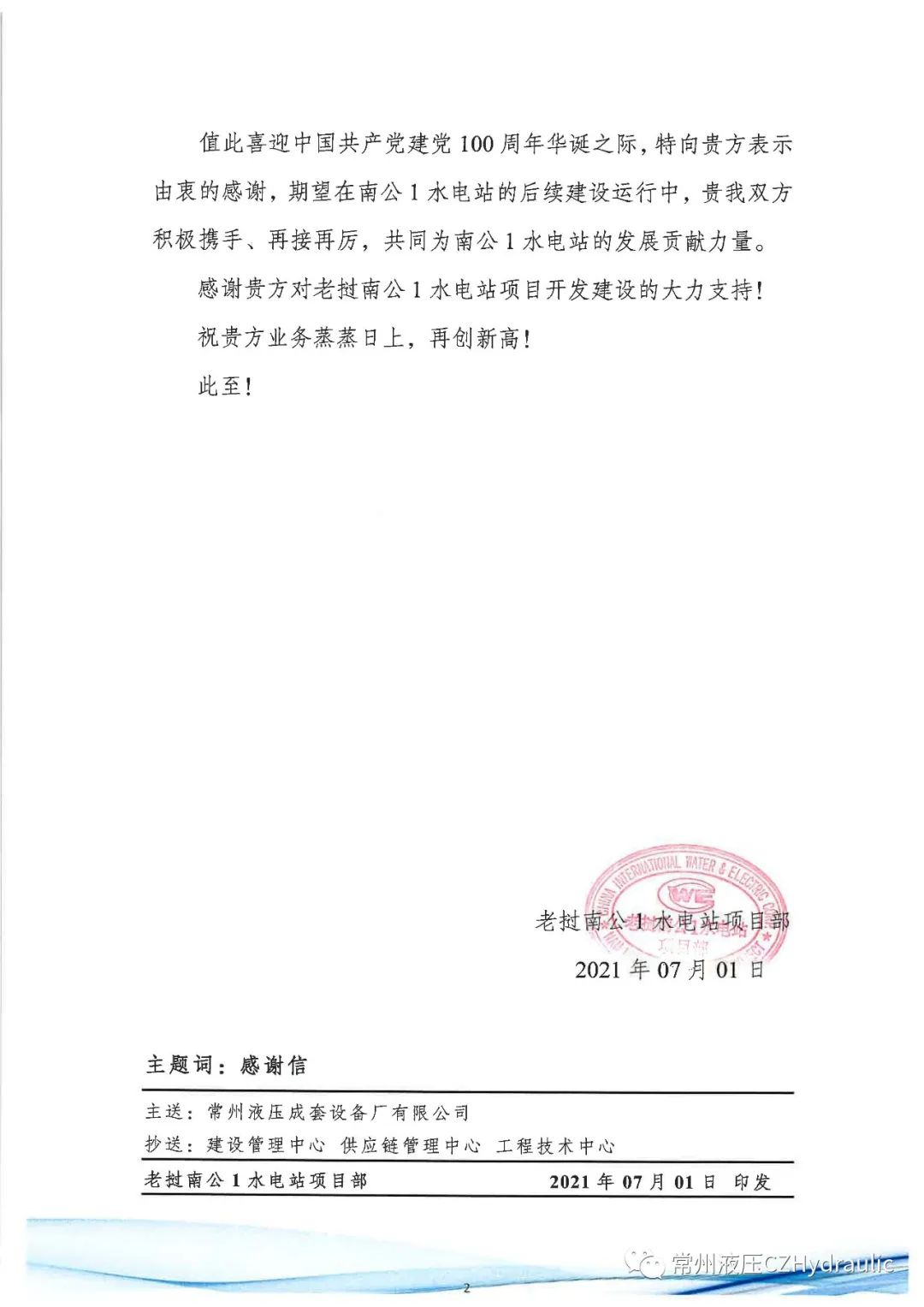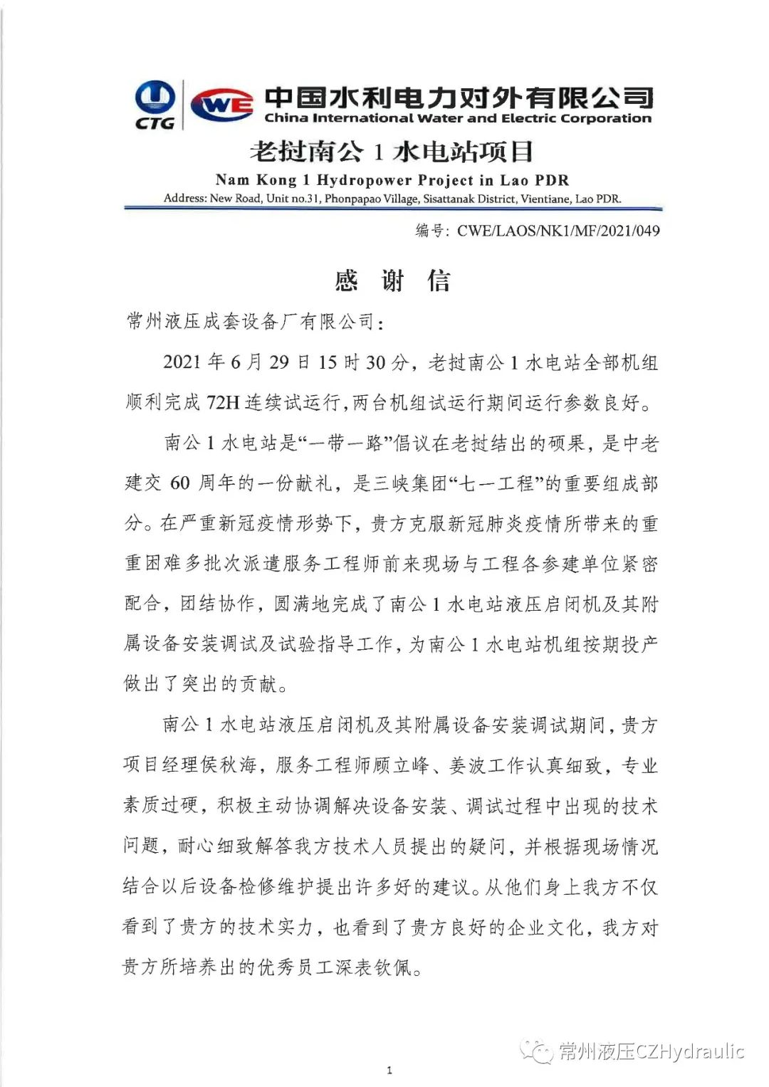 喜迎中國(guó)共產(chǎn)黨建黨100周年華誕之際,老撾南公1水電站項(xiàng)目部發(fā)來(lái)感謝信,感謝常州液壓在疫情防控期間克服重重困難派遣服務(wù)工程師指導(dǎo)南公1水電站液壓?jiǎn)㈤]機(jī)及其附屬設(shè)備安裝調(diào)試工作,項(xiàng)目經(jīng)理積極協(xié)調(diào)解決現(xiàn)場(chǎng)問(wèn)題,保障了南公1水電站機(jī)組按期投產(chǎn)發(fā)電!