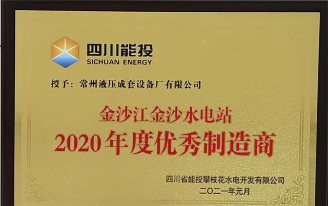喜訊 | 常州液壓成套設(shè)備廠有限公司榮獲“金沙江金沙水電站2020年度優(yōu)秀制造商”稱號!